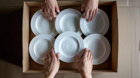 hands carefully stacking plates into a cardboard moving box, illustrating the meticulous process of packing and securing fragile items for relocation