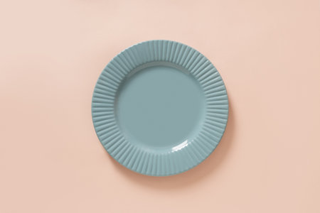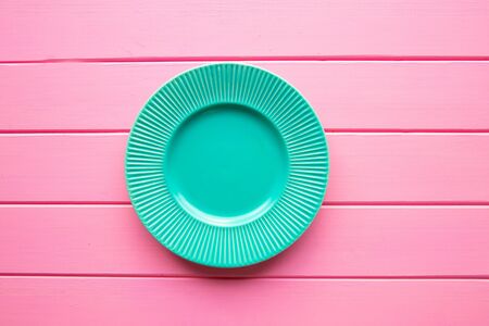 Elegant empty blue ceramic plate on pink background. Mock up. Fitchen decor, food styling, or dining presentations. Newborn color.
