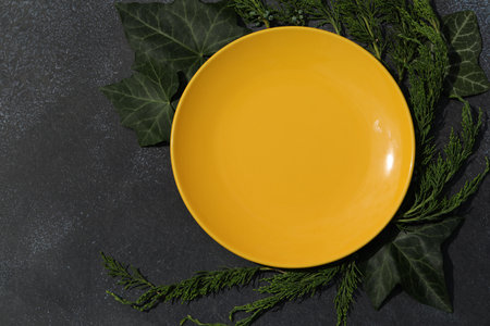 A gray, beautiful plate in the center, on a yellow background, full screen.
