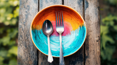A colorful dish with a spoon and fork placed elegantly on the side, ready for a delicious meal.