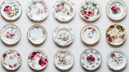 A stunning arrangement of vintage floral plates showcasing intricate designs and patterns, perfect for home decor, dining settings, or collector