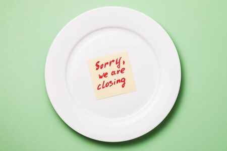 Note with text in a white plate on a green background, top view. Concept on the topic of closing the restaurant business in connection with the covid-19 pandemic