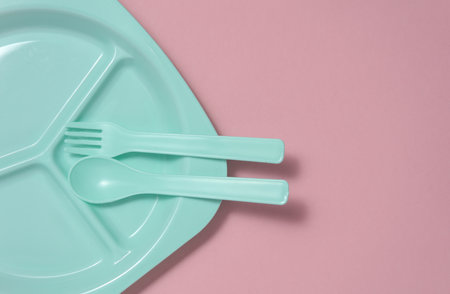Separate plastic plate with spoon and fork for feeding baby on pink background. Top view