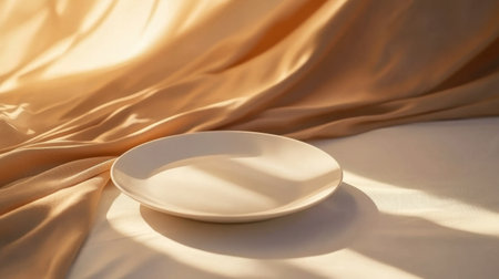 A simple white plate rests on smooth, draped fabric, illuminated by soft light, creating a serene and inviting atmosphere perfect for culinary or artistic presentations.
