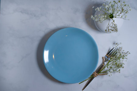 Pastel blue plate on pink and blue background, minimalist design. Culinary and dining concept