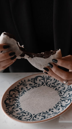 A woman photographs food on the phone in a restaurant. Close-up of hands