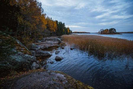 Autumn fairy tale in Kainuu, Finland. The colorful deciduous trees play with all their colors and reflect on the lake surface on a cloudy day. Orange, Green, blue colors.