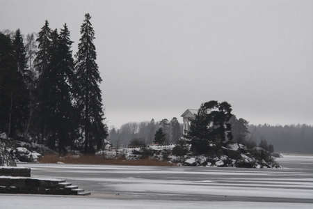 Beautiful landscape with icy lake in the national park Repovesi, Finland