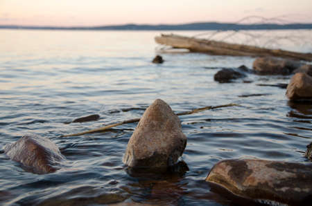 Natural stones on the shore of a lake at dusk. Tranquil scene, relaxing calm, zen meditation background.