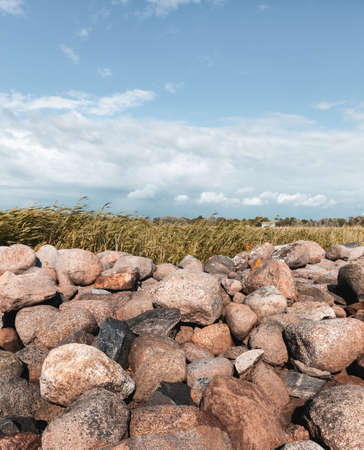 View of ancient cobble stone pier in Ainazi, Latvia. Rocky Ainazi pier in the Baltic Sea dividing Latvia and Estonia