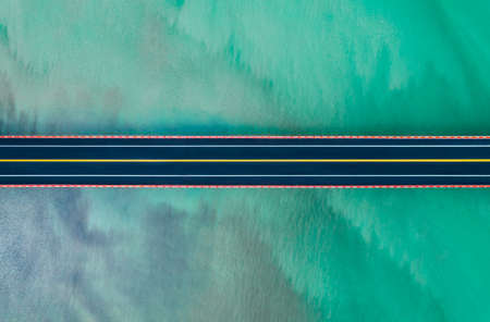 Aerial view of highway in the ocean. Cars crossing bridge interchange overpass. Highway interchange with traffic. Aerial bird's eye highway. Expressway. Road junction. Car passing. Bridge with traffic