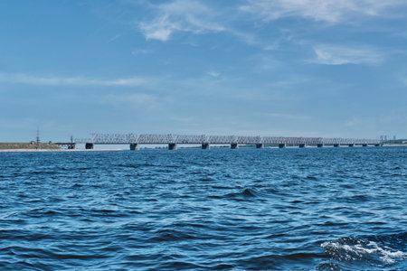 Imperial Bridge, combined road and rail bridge across Volga River, Kuibyshev Reservoir, Ulyanovsk, Russia. Train coming over bridge. View from water. Summer landscape.