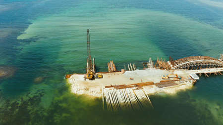Pile hammer working on construction site. Bridge under construction over the sea bay connecting the two parts of Siargao island.