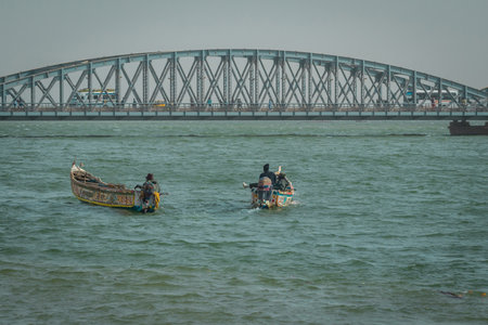 Typical senegalese fishermen with boats called pirogue floating towards famous faidherbe metal bridge over senegal river. Beautiful african postcard..