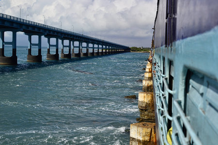 Indian railway train on the Pamban Bridge that connects Rameswaram on the Island with mainland. View to the road bridge and ocean.