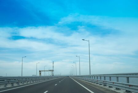 Perspective view of a concrete bridge. Landscape of the sea, bridge with blue sky and cloud background