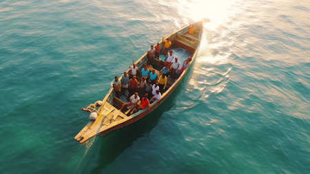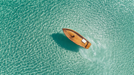 Breathtaking aerial view of a small wooden boat gracefully sailing on crystal clear turquoise water, creating a mesmerizing ripple effect and inviting a sense of tranquility and escape