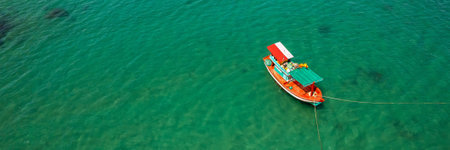 fisherman boat and Vintage wooden boat in sea. Boat drone photo..Aerial view of tropical island beach holiday yacht on blue reef ocean
