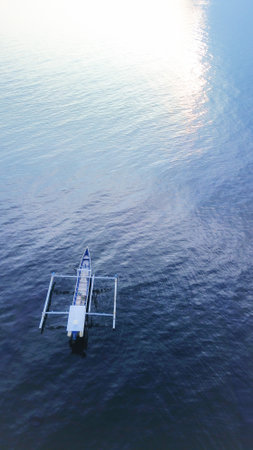 Aerial view of few fishing boats floating on the water in Bohol island, Philippines. Crystal clear water - transparent water.
