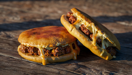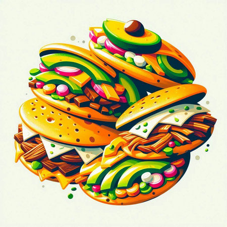 close-up of a stack of tacos with melted cheese and juicy fillings, created with generative ai