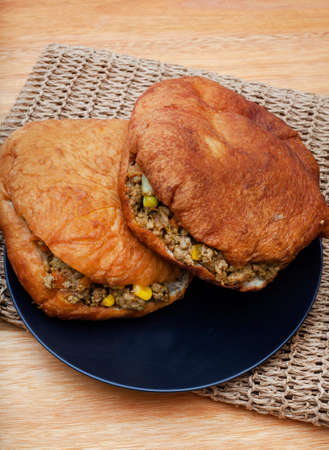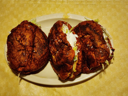 Gordita mexican fried puff corn taco filled with pastor meat lettuce and cream