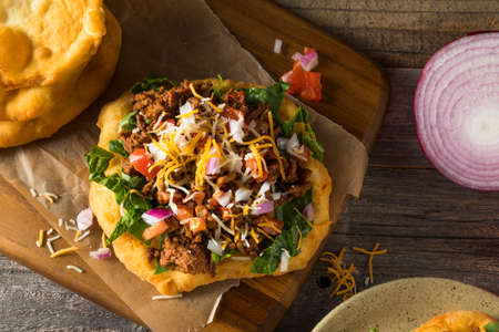 Homemade Indian Fry Bread Tacos with Ground Beef Lettuce and Tomato