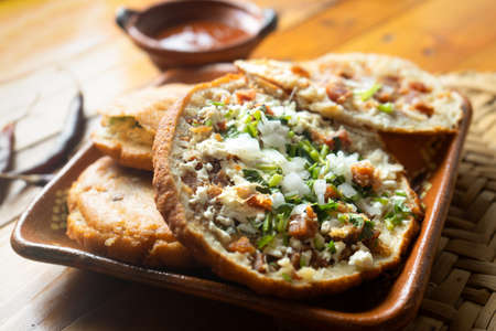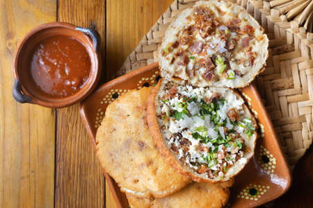 Sope pocho, typical Mexican food served with condiments on a wooden table.