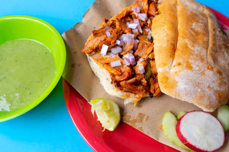 Mexican food: pork sandwich also known as torta al pastor on colorful background