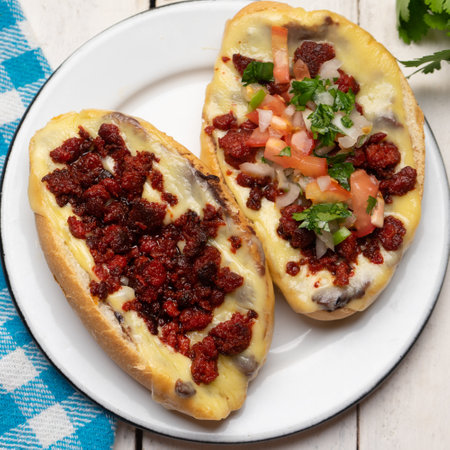 Traditional mexican molletes with chorizo and fresh sauce on white background