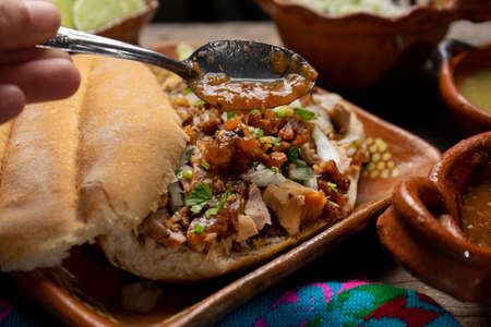 Traditional mexican pork sandwich with red sauce also called torta ahogada