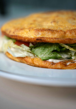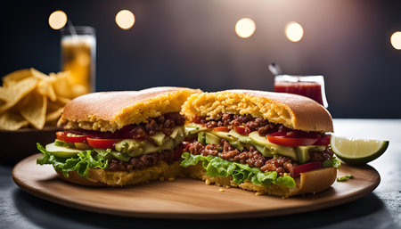 A mouthwatering sandwich featuring fresh avocado, tomato, and lettuce, nestled between a soft cornbread bun. The fillings are layered on top of a flavorful ground beef base, creating a delicious and satisfying meal.