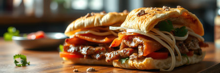 Delicious sandwiches featuring grilled beef, fresh vegetables, and herbs served in a cozy cafe setting