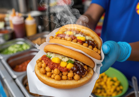 A street food vendor is holding two steaming trinidadian doubles, a spicy chickpea curry sandwich served in fried bara flatbread.