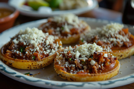 A plate of sopes, a traditional Mexican dish made with thick corn tortillas that are topped with meat, beans, cheese, and salsa.