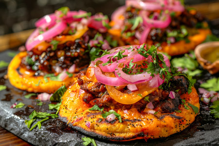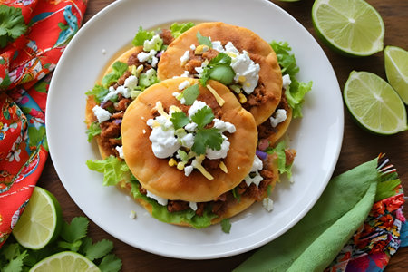 Traditional Mexican Tostadas with Spicy Beef, Beans, Cheese, and Pickled Onions on Rustic Wooden Background AI Generative