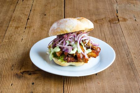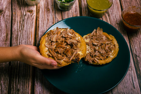 Confit pork sandwich called Torta de carnitas on wooden background. Traditional Mexican food