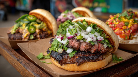 A mouthwatering display of gourmet burgers showcases vibrant fresh ingredients in a lively festival atmosphere, perfect for any food lover.