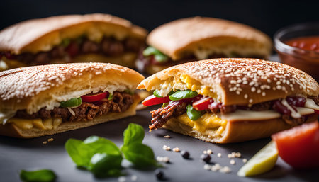 Three mouthwatering sandwiches filled with juicy meat, melted cheese, and fresh vegetables, ready to satisfy any craving.