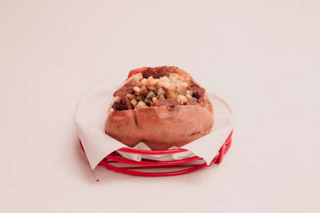 Baked kumpir potato stuffed with the cheese, sausage, olives, peppers and corn