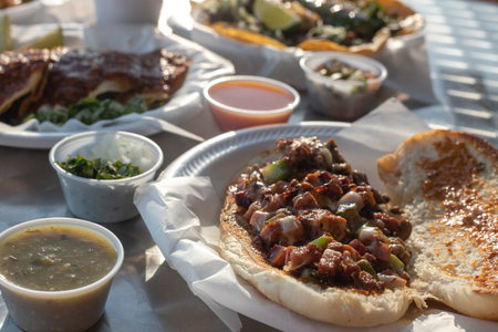 Close-up of a flavorful shepherd's meat cake, a popular Mexican street food. The sandwich, filled with marinated pork, fresh cilantro, and onions, is showcased with additional street food dishes and beverages. Perfect for food enthusiasts and culinary photography.