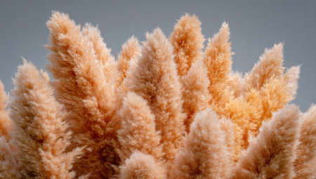 Close-up of feathery, peach-colored reeds against a plain grey backdrop, soft texture