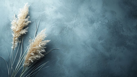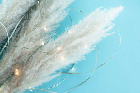 Trendy botanical background with fluffy pampas grass on blue. Interior design boho style plant decor