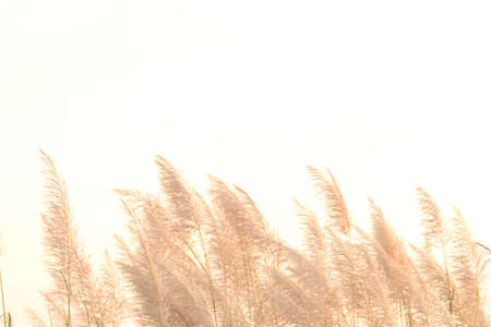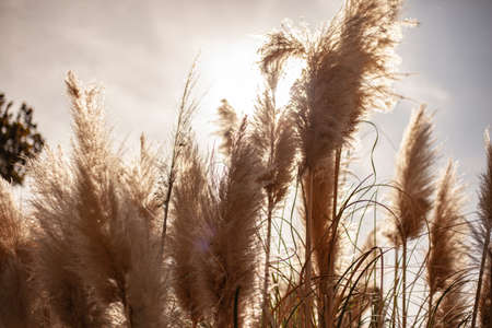 Fluffy reeds on a light sky background against sunlight. Abstract nature background for vertical posters design. Blurred selective focus.
