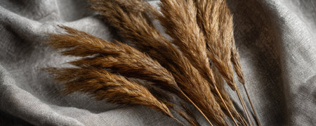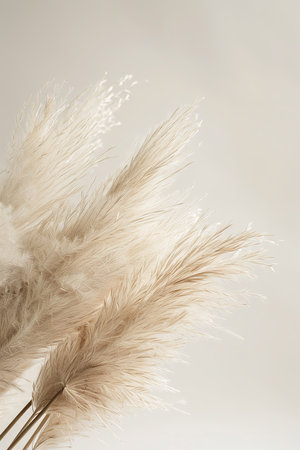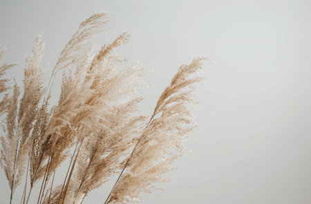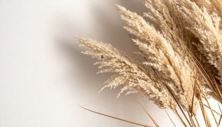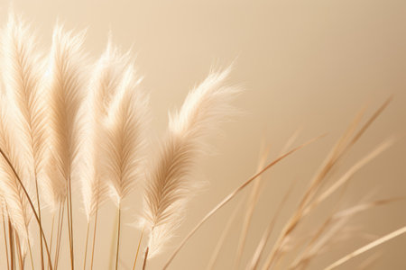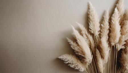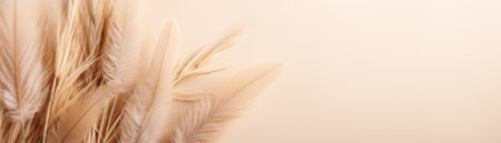 Elegant beige pampas grass plumes on a smooth beige background with ample copy space, evoking a serene and natural aesthetic. Boho style. Natural backdrop with pastel colors. Banner. Generative AI.