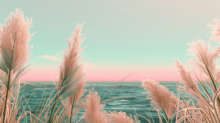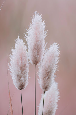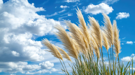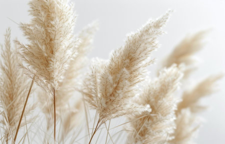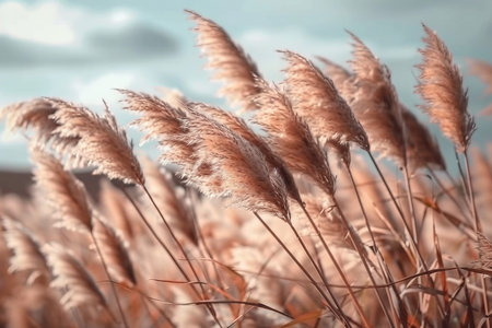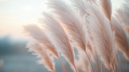Close-up of pampas grass moving gracefully with the wind, soft focus on the feathery plumes, evoking a sense of calm and tranquility.