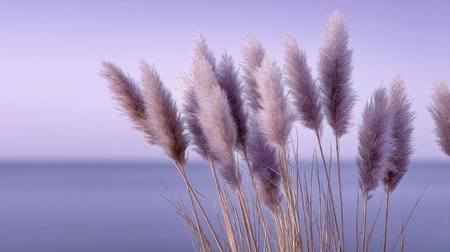 A stunning close-up of pampas grass stalks in soft lavender hues, set against a tranquil lake at sunset, creating a serene and calming atmosphere. Perfect for nature lovers.