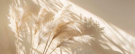 Pampas grass in sunlight with shadows on beige background, nature-inspired home decor