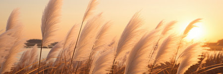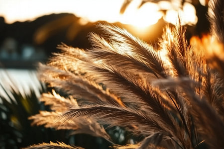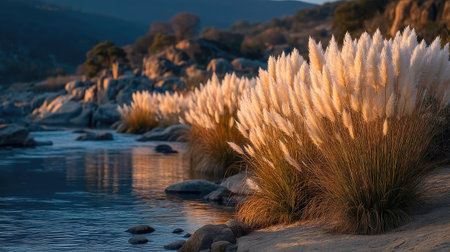 Tall stalks of pampas grass stand gracefully, their golden plumes illuminated by soft sunlight at dusk. The tranquil atmosphere invites a sense of calm and connection to nature.