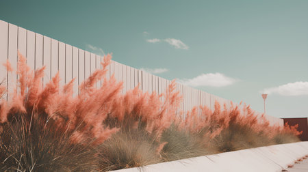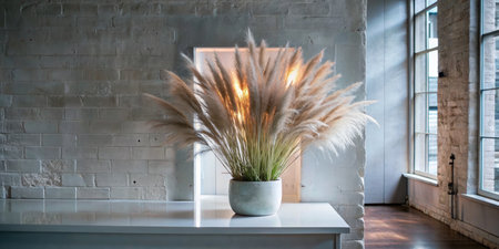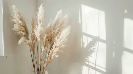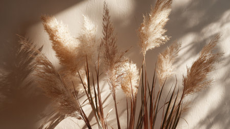 Pampas grass stands tall in soft light casting gentle shadows on a textured wall creating tranquility.