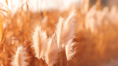 Abstract natural background of soft plants Cortaderia selloana. Pampas grass on a blurry bokeh, Dry reeds boho style. Fluffy stems of tall grass. ai generative.
